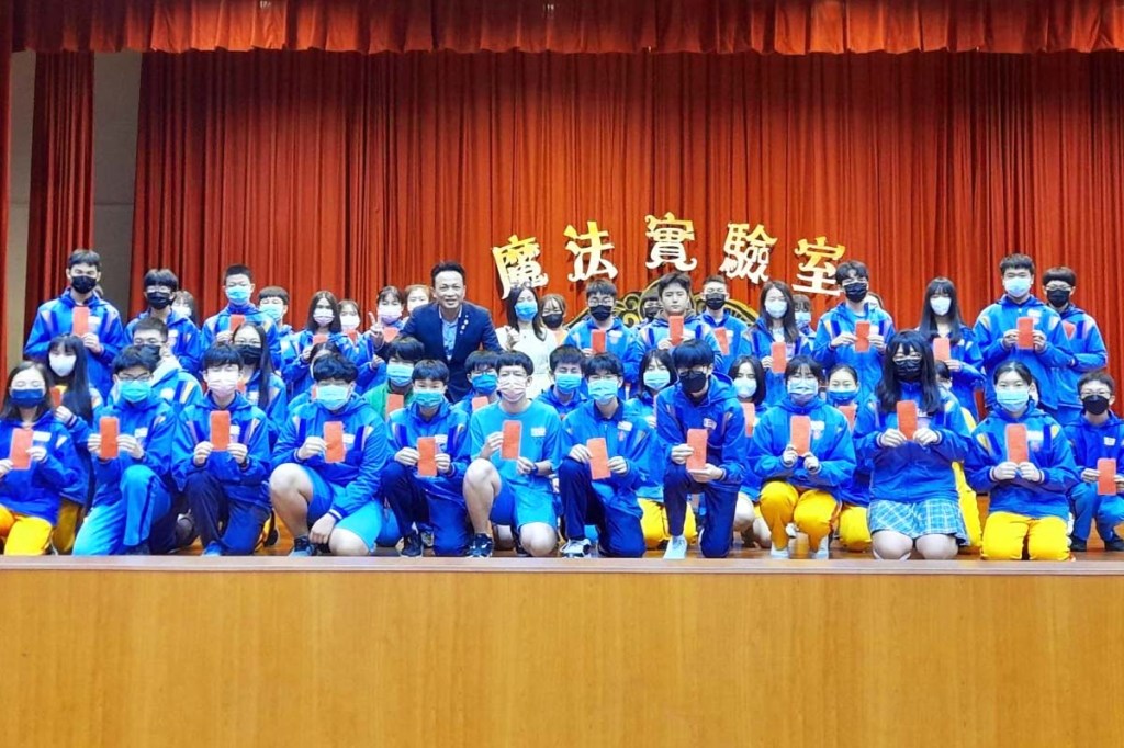 簡志祥先生在國三生大考將至前至校勉勵學生並頒發獎學金以資鼓勵。